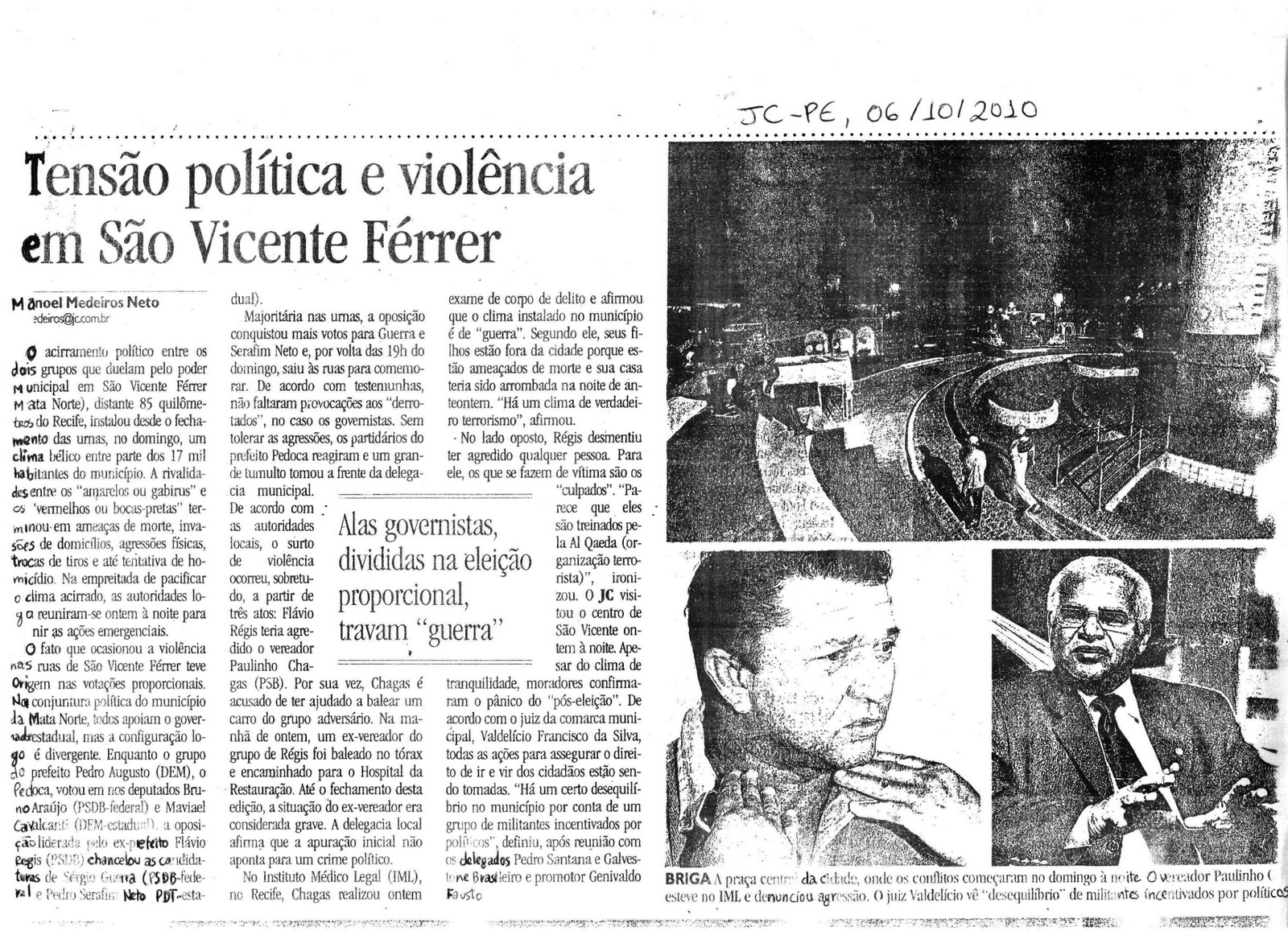 com troca de acusações entre os grupos rivais do município, devido aos resultados das eleições realizadas, domingo passado. “Os candidatos apoiados pela oposição ganharam dos candidatos apoiados pelo prefeito (Pedoca-DEM). Por conta disso, ficou um clima tenso na cidade, com os ânimos acirrados”, alegou Jadiel Lopes de Albuquerque, assessor da Prefeitura de Jaboatão, que tem residência em São Vicente.